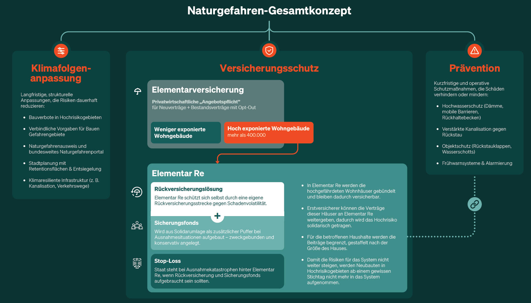 Die Versicherungsbranche hat ein Konzept vorgelegt, wie sich alle Häuser gegen Naturgefahren versichern lassen sollen. Zentraler Baustein für (flut)flächendeckenden Elementarschutz ist das neue Modell Elementar Re. Der Name spielt darauf an, dass Naturschäden, zum Beispiel durch Hochwasser und Starkregen auch als Elementarschäden bezeichnet werden.