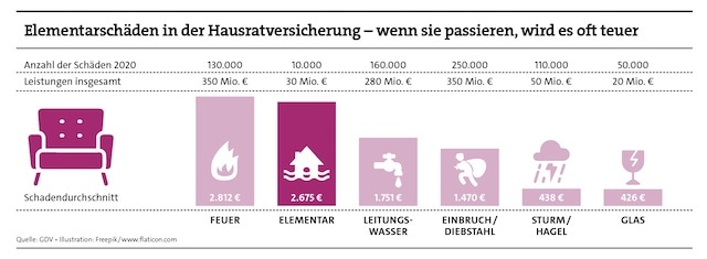 Stellt sich die Frage, wie einträglich das Elementargeschäft für die Branche eigentlich ist? Zwar sind die Durchschnittsschäden infolge von Elementarschäden in der Hausratversicherung laut aktueller GDV-Daten vergleichsweise hoch. Gleichwohl fallen sowohl bei den Leistungen als auch bei der Zahl der Schadenereignisse andere Gefahren wie Feuer, Einbruchdiebstahl oder Leitungswasser stärker ins Gewicht (siehe Grafik oben). Lohnt sich der Elementarbaustein für die Anbieter rein betriebswirtschaftlich betrachtet also? Oder droht womöglich bald ein deftiger Prämienzuschlag?