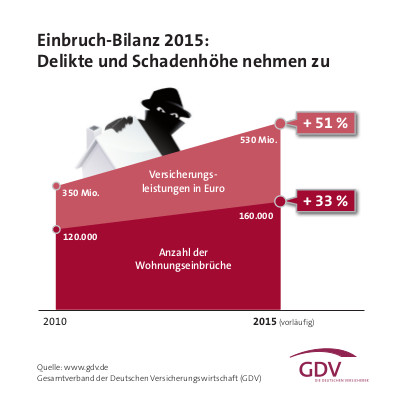 In den vergangenen fünf Jahren haben Einbrüche um mehr als 30 Prozent zugenommen, der Schadenaufwand um über 50 Prozent. 2014 waren es 150.000 Einbrüche, die Versicherungsleistung betrug 480 Millionen Euro. Das geht aus dem Einbruch-Report 2016 hervor, den der Gesamtverband der Deutschen Versicherungswirtschaft (GDV) vorgelegt hat.