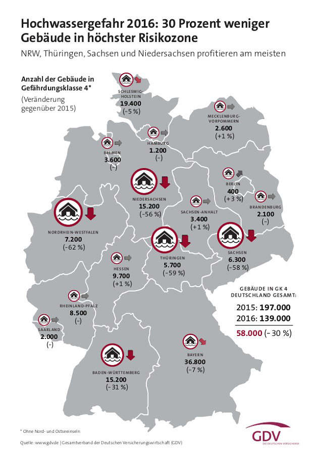 2016 waren laut GDV 139.000 Häuser in die höchste Zürs-Gefahrenklasse 4 eingeordnet. Im Vorjahr waren es noch 197.000 von bundesweit mehr als 21 Millionen Adressen. Damit liegen 0,7 Prozent aller Gebäude in der Zone 4, in der statistisch mindestens ein Hochwasser in zehn Jahren zu erwarten ist.